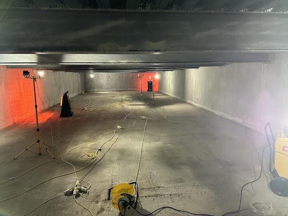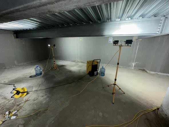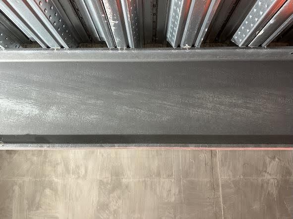 The tank had just been formed and had been coated with a cementitious coating. The tank was thoroughly dried with heaters / dehumidification plant and vacuumed to remove all dust & building debris. The high level steels were then prepared to accept the coating.